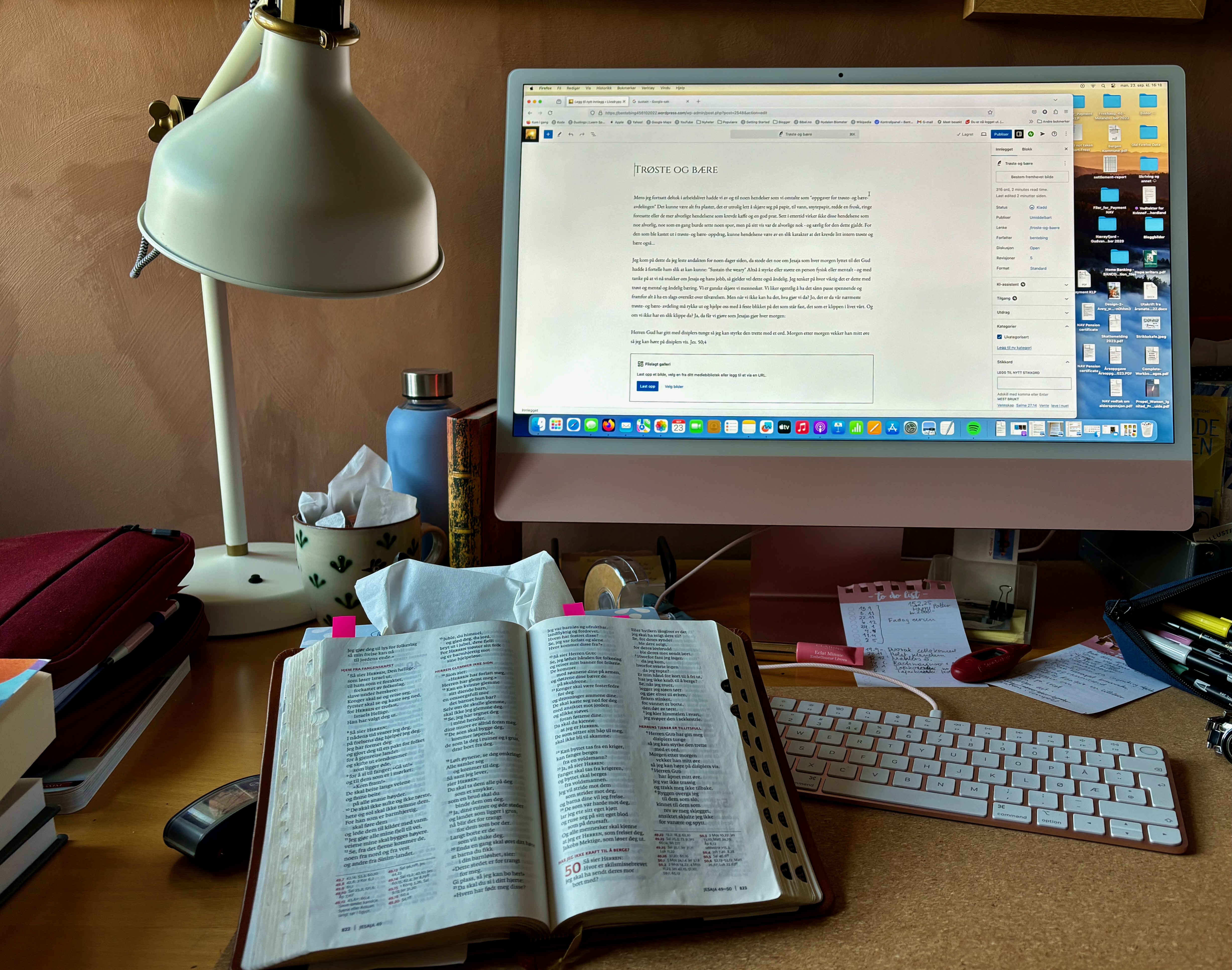 Jeg kom på dette da jeg leste en andakt for noen dager siden, da stod det noe om Jesaja som hver morgen lyttet til det Gud hadde å fortelle ham slik at kan kunne: «Sustain the weary» Altså å styrke eller støtte en person fysisk eller mentalt – og med tanke på at vi nå snakker om Jesaja og hans jobb, så gjelder vel dette også åndelig. Jeg tenker på hvor viktig det er – dette med trøst, mental og åndelig bæring. Vi er ganske skjøre vi mennesker. Vi liker egentlig å ha det sånn passe spennende og framfor alt: – å ha en slags oversikt over tilværelsen. Men når vi ikke kan ha det, hva gjør vi da? Jo, det er da vår nærmeste trøste- og bære- avdeling må rykke ut og hjelpe oss med å feste blikket på det som står fast, den som er klippen i livet vårt. Og om vi ikke har en slik klippe? Ja, da får vi gjøre som Jesajas gjør hver morgen: