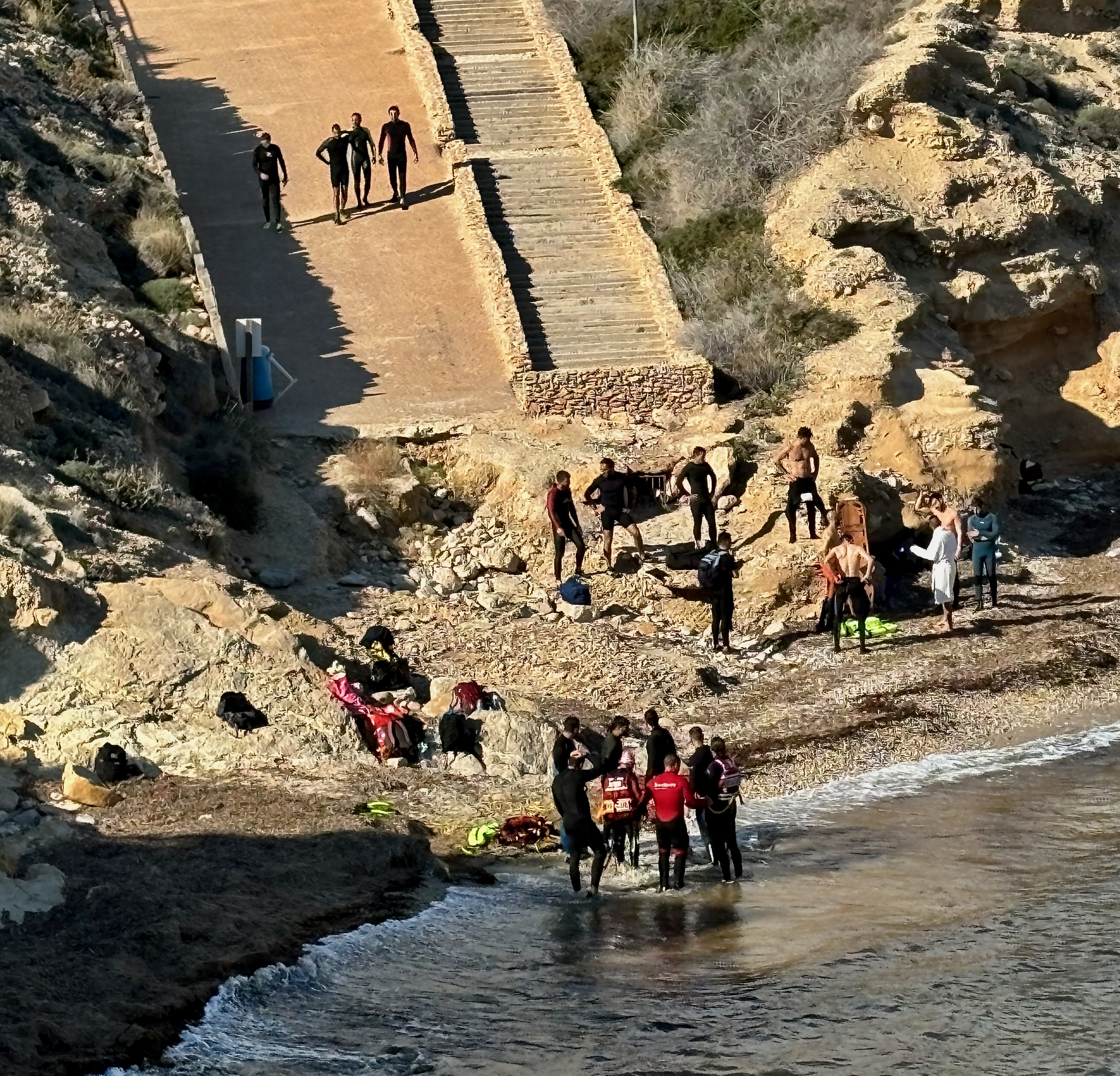 Før vi reiste hjem fra ferie gikk vi en tur i en park like ved der vi bor. På veien dit så vi en gruppe menn i tørrdrakter som tydeligvis var ferdig med en øvelse. De hadde med seg en båre, dykkerutstyr og flotører og de så ut som om de hadde holdt på en stund for flere hvilte på steinene på stranden. Da vi kom næremere så vi at det stod en bil med teksten Bomber 112, det betyr Brann 112, altså brannmenn på øvelse. Det er flott, tenkte jeg, de øver på redning, de øver slik at de er klare til innsats!